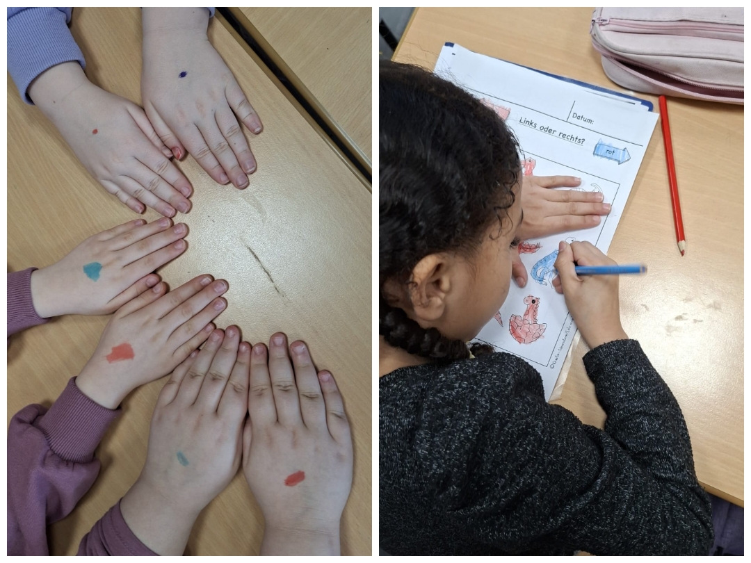 Im Mathematikunterricht haben wir uns mit Links und Rechts beschäftigt. Dabei durften wir uns ausnahmsweise mit Filzstiften Punkte auf die Hände malen. Auf der rechten haben wir einen roten und auf der linken Hand einen blauen Punkt gemalt.